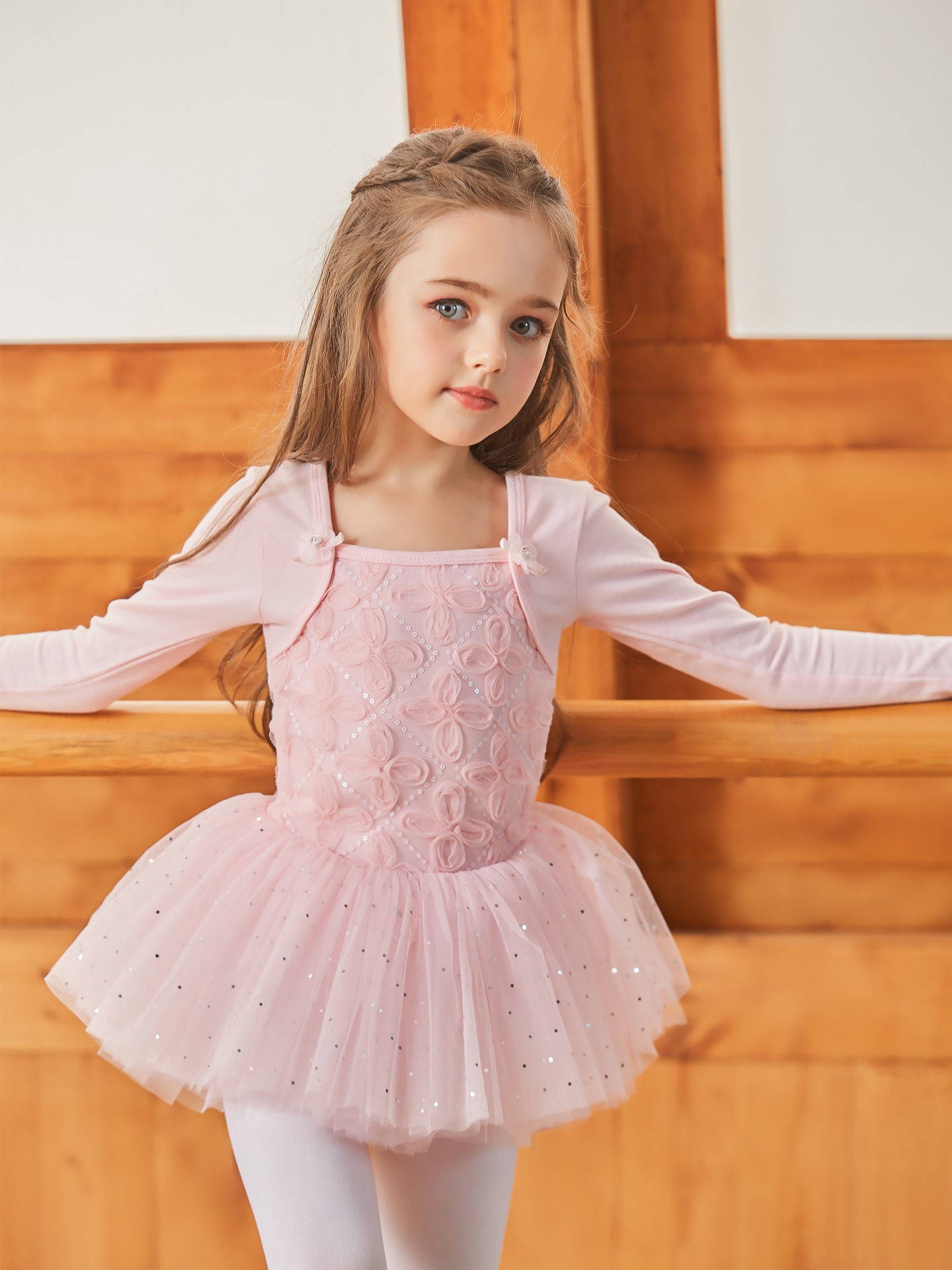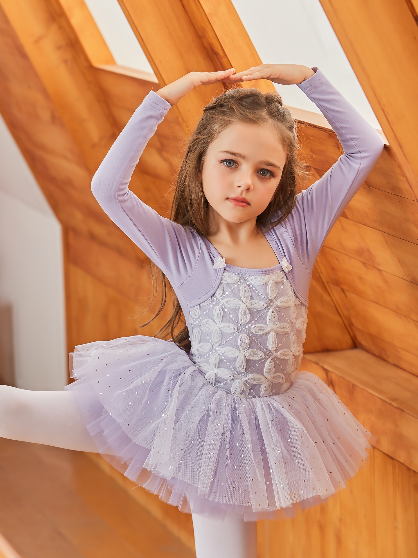 ●華やかな印象のスカート付ロングスリーブレオタード。