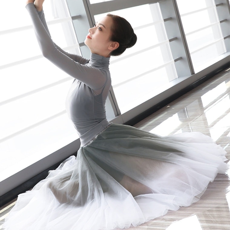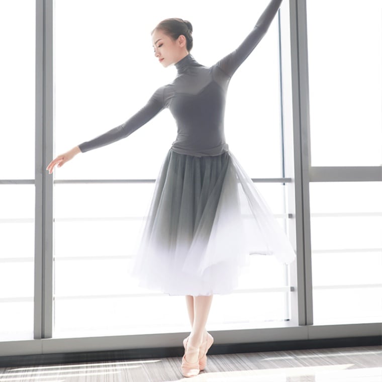首回りと気になる二の腕をカバーする少し長めの袖丈。軽くて吸い付くようなフィット感が特徴.。寒さを感じる季節にお勧めの首と肩が保温できるハイネックのトップ。首周りはストレスのない快適なフィット感。バレエやダンスのレッスンではもちろん、インナーとしてデイリーにも着用可能。