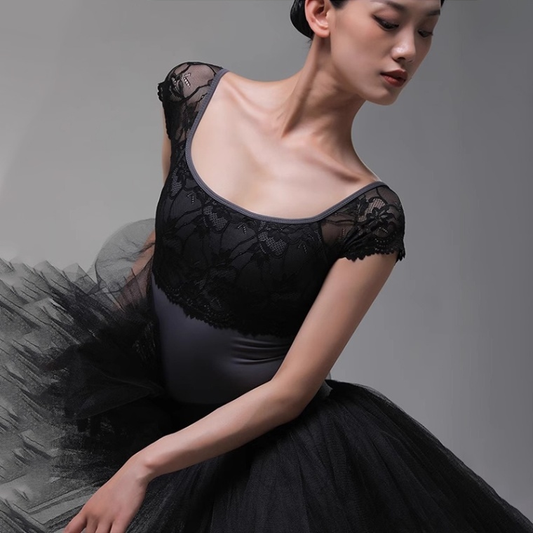 胸元、背中と袖をチュール素材で切り替えたシンプルなデザイン。コンパクトな袖丈が肩から腕のラインをすっきりと見せるフレンチスリーブレオタード。バストパッドポケット付。