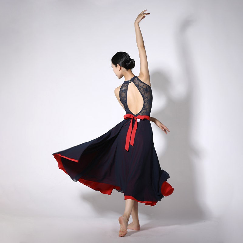 大きく開けた背開きは背中の動きを妨げないカッティング。ストレッチレースで切り替えたウエストが細見え効果の高いがポイント。ストレッチレースを使ったシャープでスタイリッシュなデザイン。