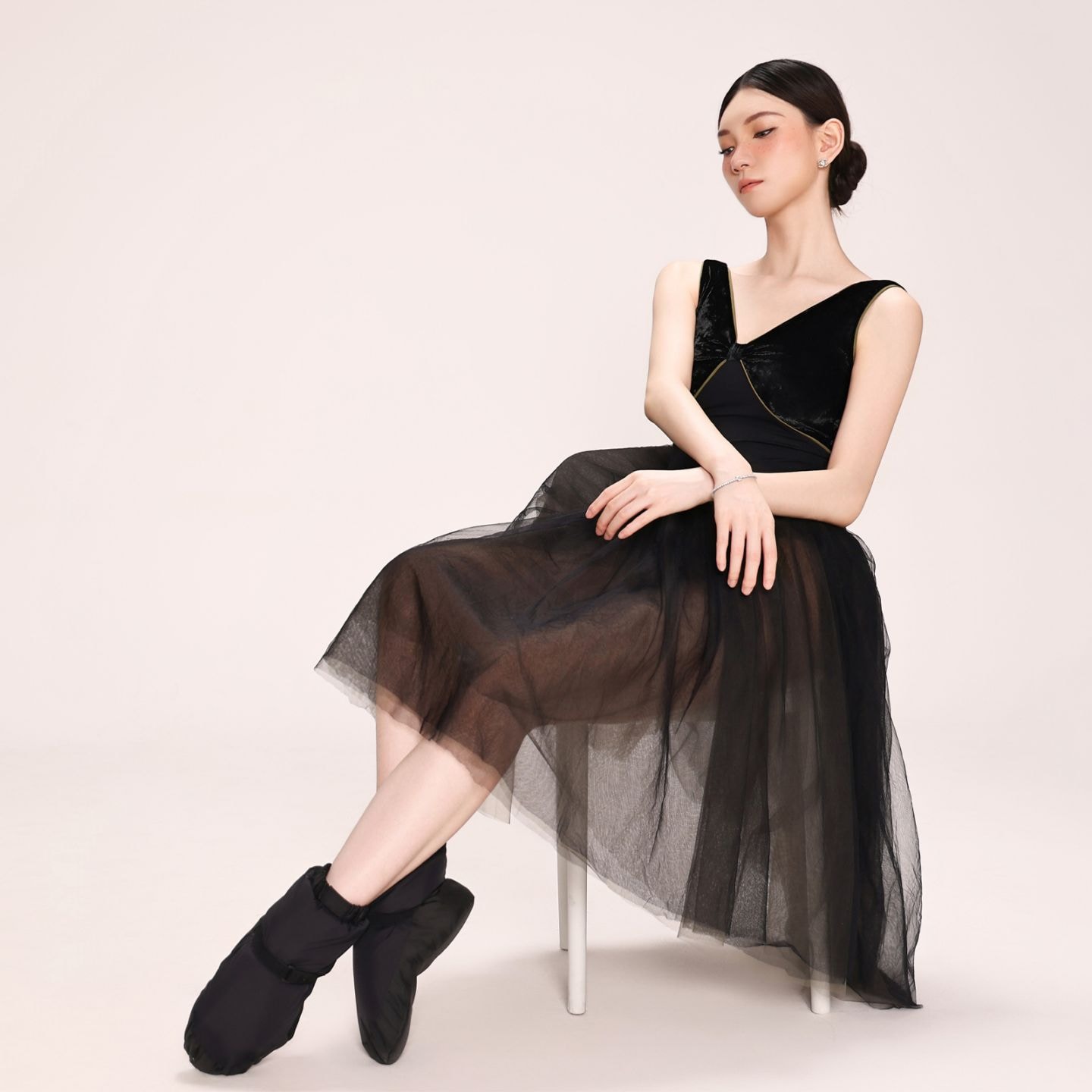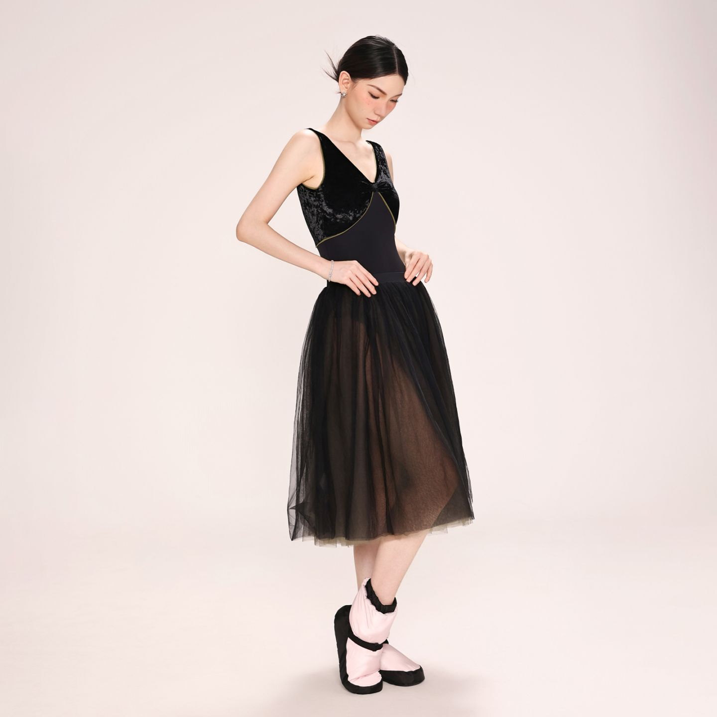 V開きのネックラインが首から肩のラインをを長く綺麗に見せる。バストパッドポケット付き。