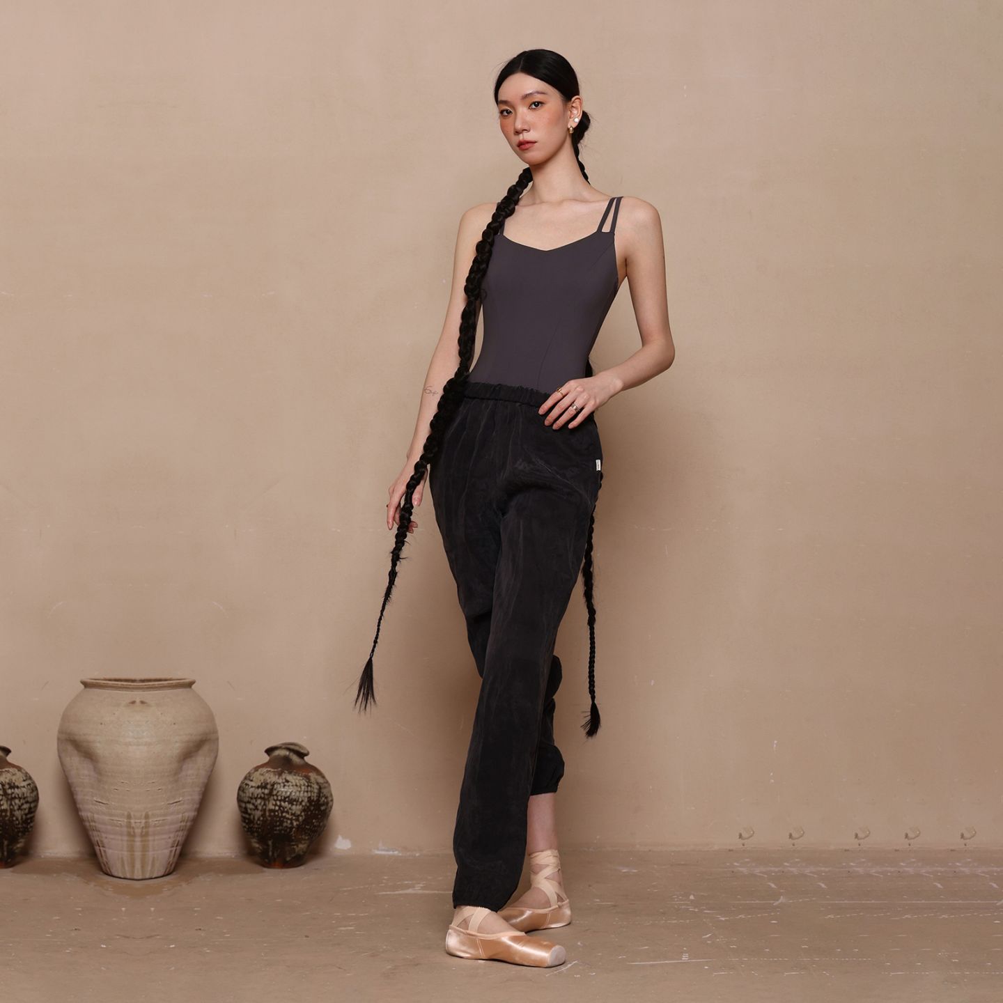 衿ぐりに繋がるストラップラインがデコルテを広く見せるキャミソールレオタード。シンプルなデザインを好む方まで幅広く対応できるデザイン。バストパッドポケット付き